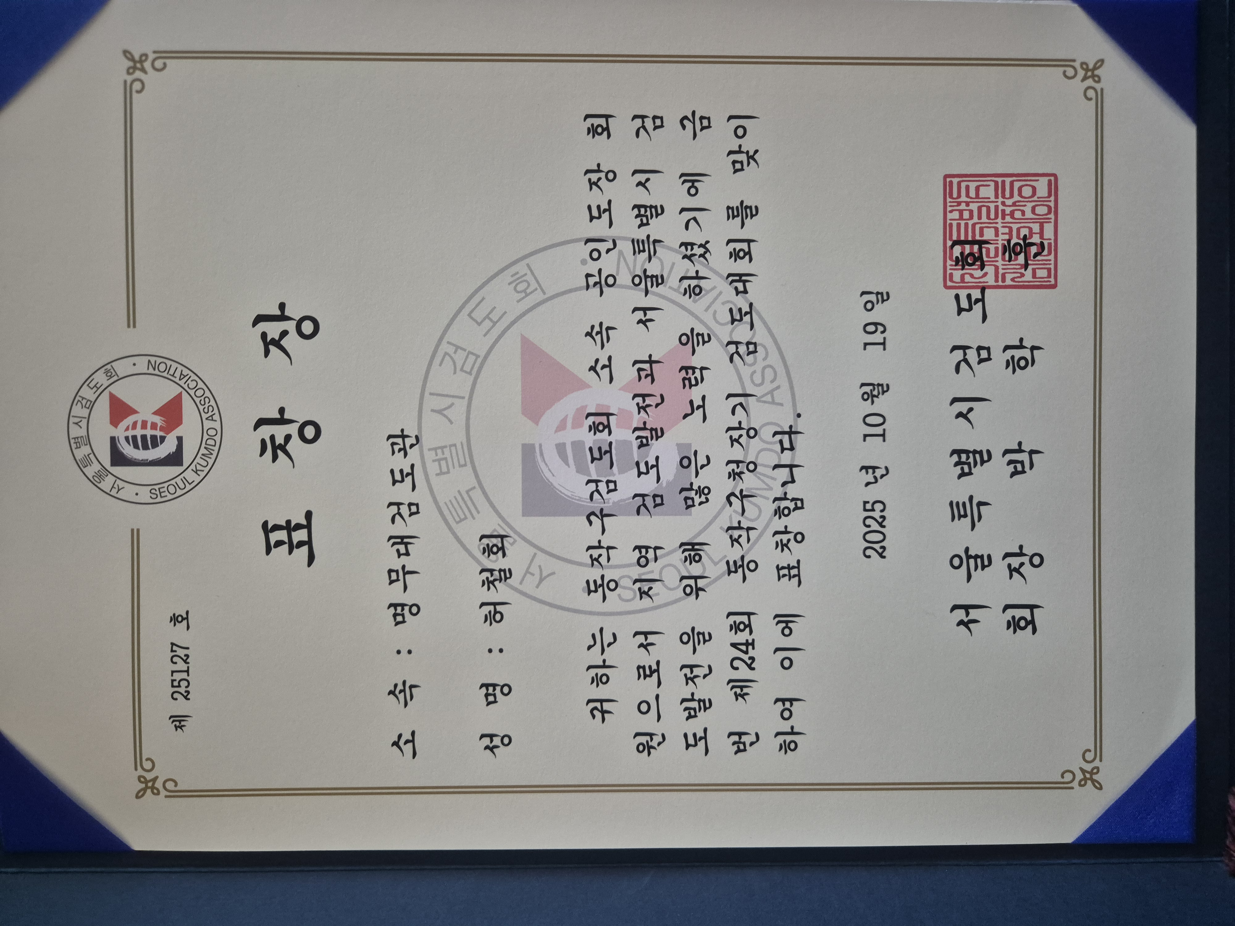 개회식 때 서울특별시 검도회 표창장도 받는 행운도 있었다.